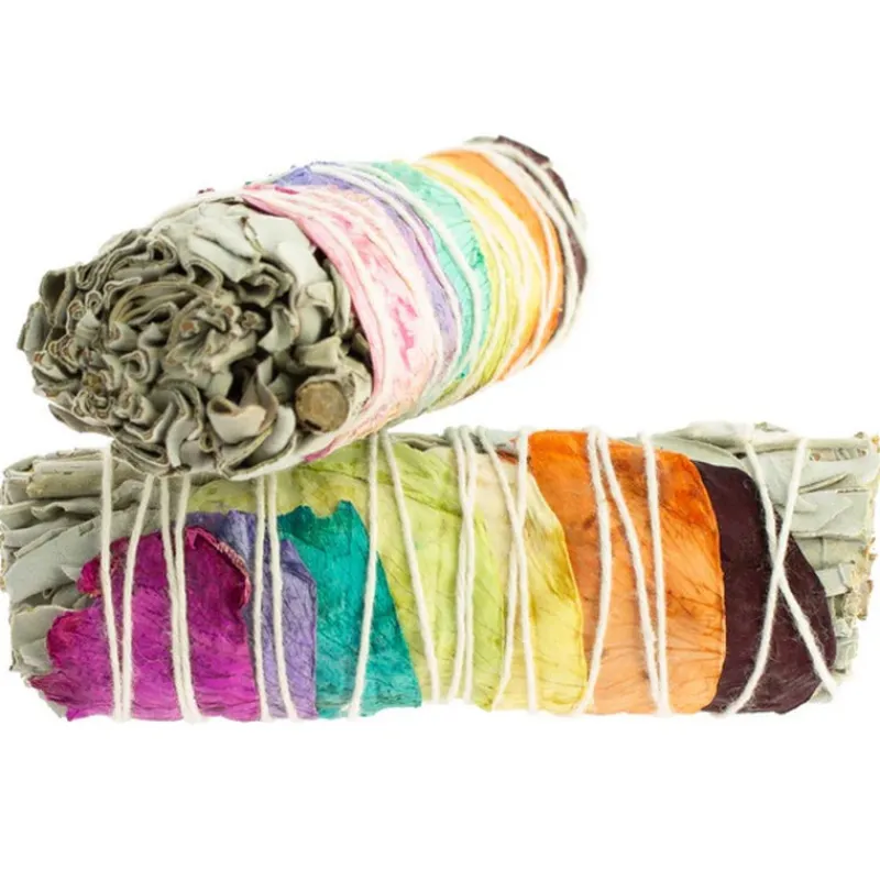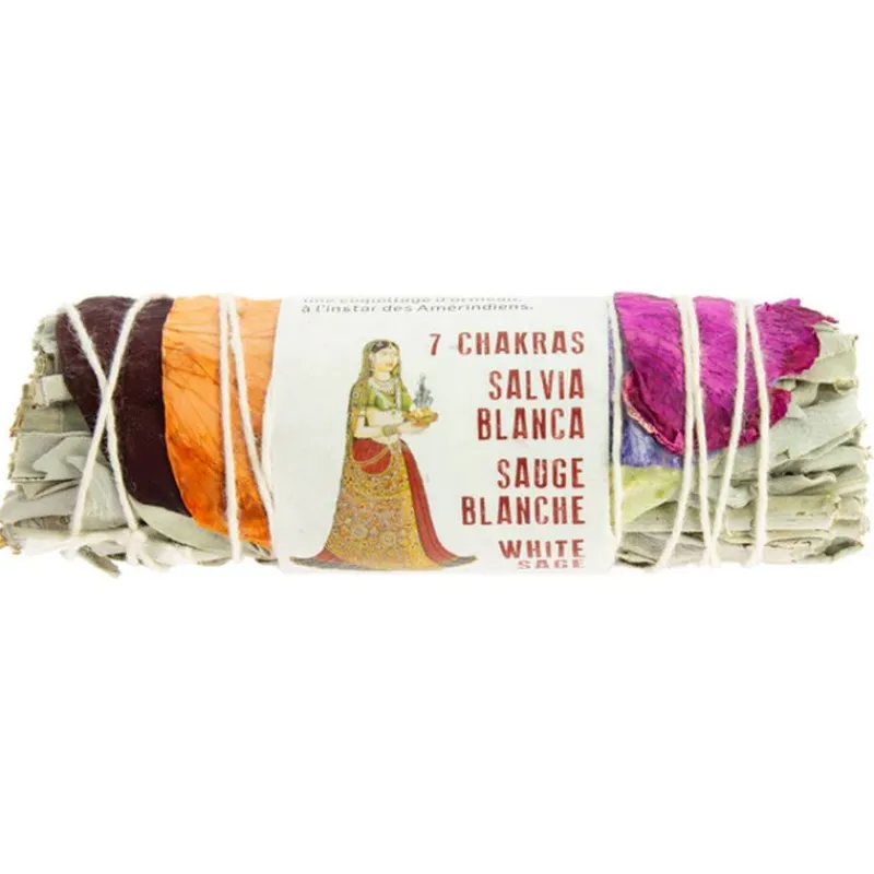 Ce bâton de sauge blanche de Tierra Zen est décoré avec des pétales de roses de différentes couleurs qui symbolisent chacun des 7 chakras du corps humain. Il est utilisé de préférence pour les rituels de purification des personnes.