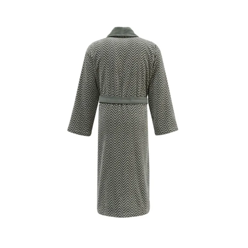 Le peignoir mixte Lentkhi de Sensei en velours, avec des motifs tissés jacquard et des tons vert eucalyptus et beige clair, est idéal lors de la sortie de douche et parfait pour un séchage optimal.