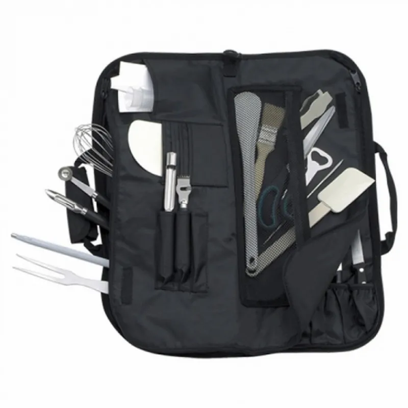 Parfaite pour transporter tous les couteaux et ustensiles dont vous avez besoin, la trousse souple Déglon est astucieuse. Pliée, elle a la forme d’une malette, facile à prendre en main grâce à ses poignées de transport. Brodée du logo Déglon et dotée d’un porte-cartes.