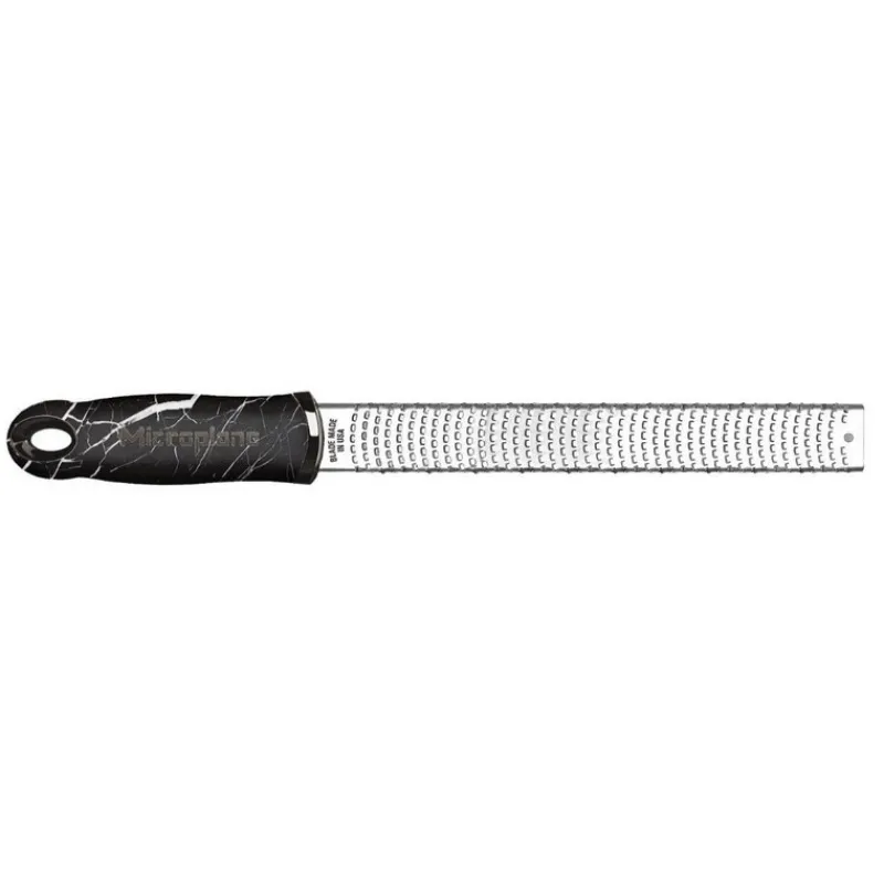 Ce classique a marqué l’histoire de Microplane grâce à ses lames ultra-affûtées et fabriquées aux USA par photochimie. Le zesteur est passé des ateliers de menuiserie à la cuisine. Il est long et étroit, à l’image des râpes à bois originelles. Non seulement le zesteur représente la manière la plus rapide et la plus efficace de râper des zestes incroyablement fins, mais il peut également être utilisé pour râper les fromages à pâte dure, le gingembre, l’ail, les épices, le chocolat, les truffes, les noix et bien plus encore.
