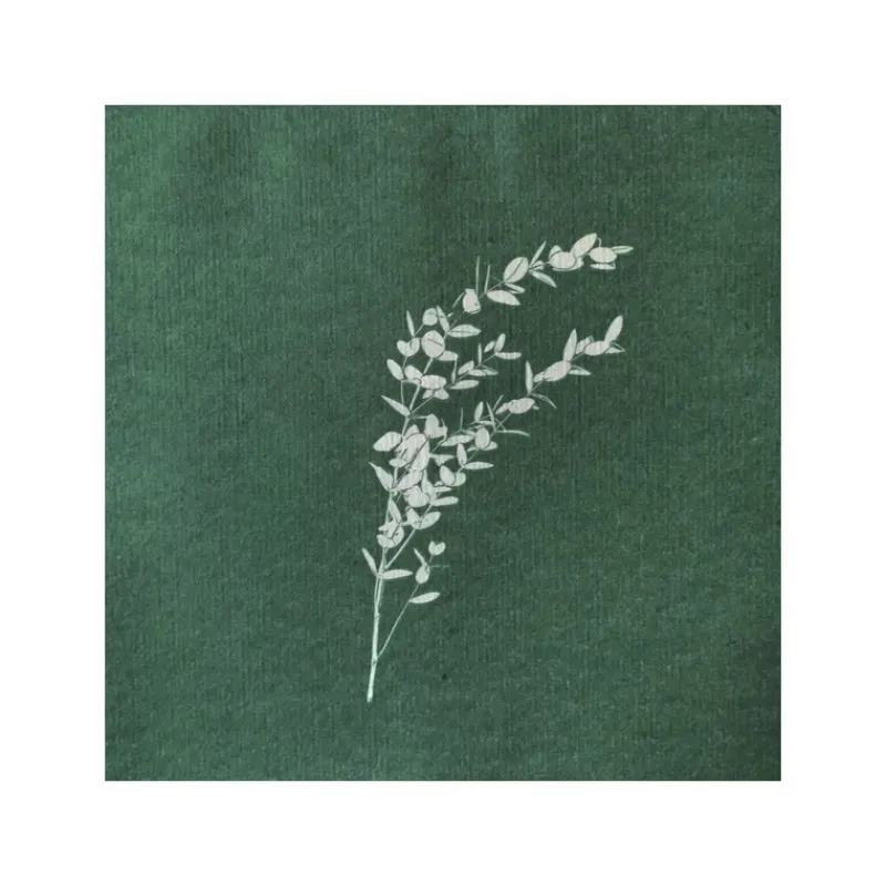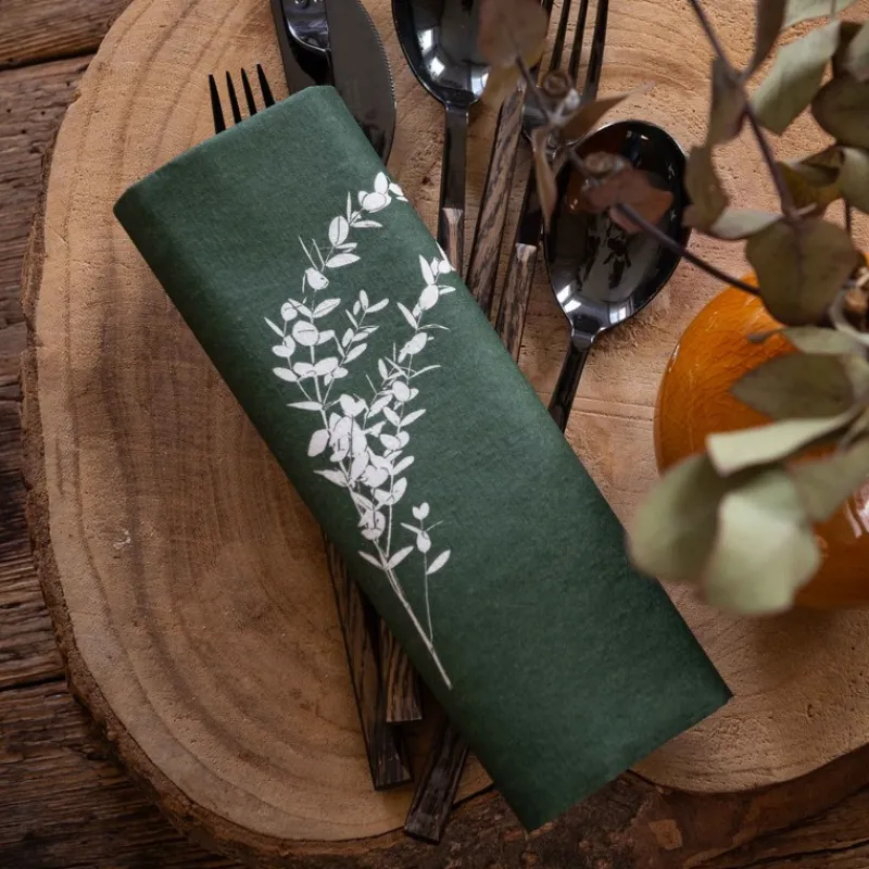 Cette grande serviette imprimée viendra parfaire votre table de réception. Françoise PAVIOT nous présente dans sa collection un modèle élégant et intemporel avec un Eucalyptus.