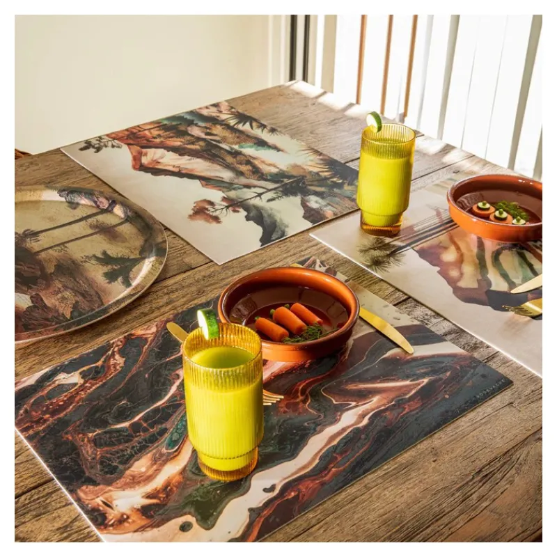 Des couleurs chaudes et un graphisme inspiré de la nature caractérisent le set de table Mamou de la maison Pôdevache.