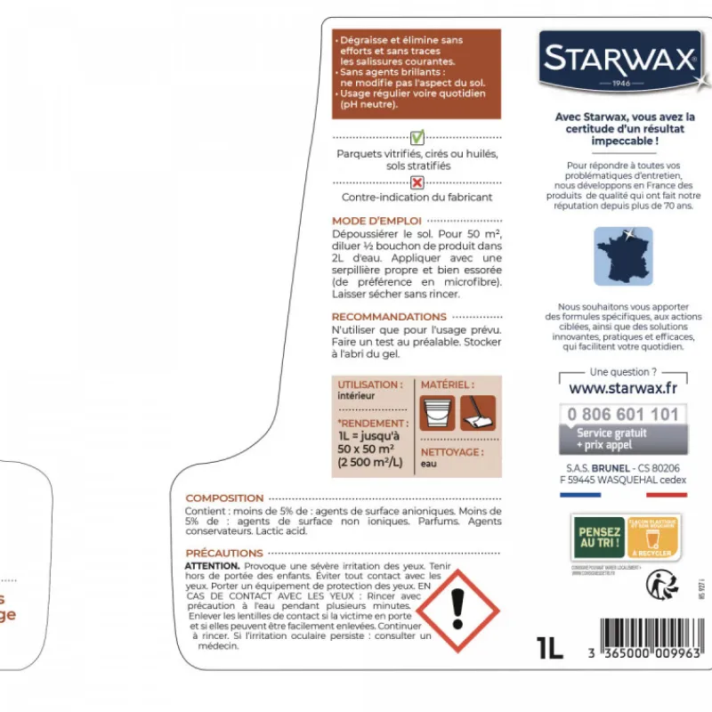 Ce Nettoyant concentré parquet & sols stratifiés de Starwax sera un produit indispensable pour retirer les tâches sur les parquets.