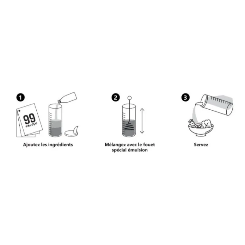 En moins de 2 minutes, votre sauce est prête. Il vous suffit d’ajouter les ingrédients dans le shaker, de mélanger avec le fouet émulsionneur et c’est tout. Il ne vous reste plus qu’à servir.