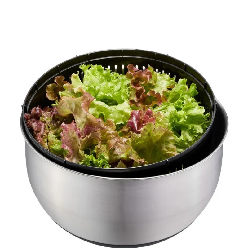 Les salades en feuilles sont séchées en douceur et extrêmement rapidement dans cette essoreuse à salade élégante et exclusive avec entraînement par câble. En effet, en l’absence de changement de direction, la salade n’est pas secouée, mais doucement filée. Une traction par câble avec un mécanisme de rappel amène l’entraînement à des vitesses élevées pour garantir des feuilles de laitue croustillantes et sèches en un rien de temps. Avec le bouton « Stop », le processus d’essorage peut être arrêté d’une simple pression sur un bouton.